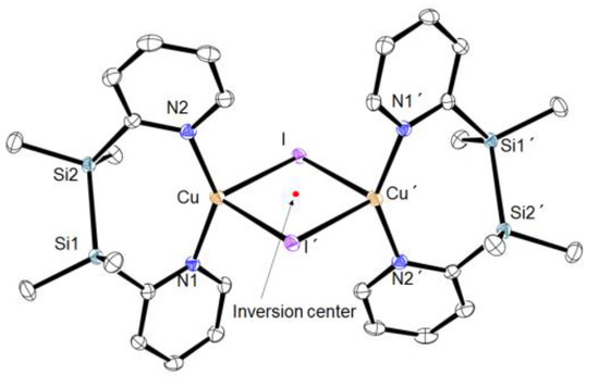 ORTEP drawing of complex 2 with thermal ellipsoids at the 50% probability level. Hydrogen atoms were omitted for clarity. Selected bond lengths and angles. Cu…Cu′: 3.8761(3) Å. Cu‒I: 2.7405(3) Å. Cu‒I′: 2.9689(3) Å. I…I′: 4.1982(3) Å. Cu‒N1: 1.987(2) Å. Cu‒N2: 1.993(2) Å. Si1‒Si2: 2.3441(7) Å. Cu…Si1: 3.3453(5) Å. Cu…Si2: 3.2611(5) Å. Cu‒I‒Cu′: 85.417(7)°. I‒Cu‒I′: 94.583(7)°. N1‒Cu‒N2: 140.45(6)°.