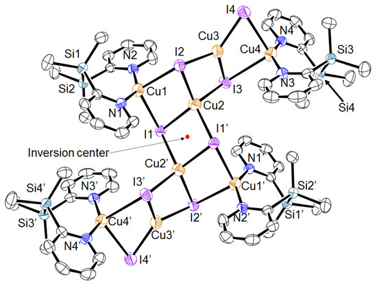 Octacopper(I) iodide complex [Cu4I4(1)2] (3) was obtained by a reaction of ligand 1 and CuI in a 1:2 ratio (Scheme 1b). Elemental analysis of 3 gave the expected composition. The single crystals suitable for X-ray diffraction were obtained by recrystallization from tetrahydrofuran and n-hexane. Complex 3 crystallized in the monoclinic space group P21/c. The crystal structure of 3 is shown in Figure 2, which can be interpreted by a dimer of a ladder [Cu4I4(1)2] cluster. In the asymmetric unit of complex 3, three copper centers (Cu1, Cu2, and Cu4 in Figure 2) have a quasi-tetrahedral environment, and the other (Cu3) has quasi-trigonal planar geometry. These copper centers are bridged by three µ3-I and one µ2-I ligands, and the copper centers at the apical positions are supported by chelating ligand 1. The Cu‒I bond distances of the trigonal planar copper(I) center (2.50–2.56 Å) are in the normal range of those of Cu‒I complexes [46,47,48]. Similarly to complex 2, the Cu‒I bond lengths of copper centers supported by ligand 1 (Cu1‒I1, 2.8580(5) Å; Cu1‒I2, 2.9034(5) Å; Cu4‒I3, 3.0754(5) Å; Cu4‒I4, 2.8532(5) Å) are significantly longer than other reported complexes. Cu…Cu distances are also larger than the double of Cu(I) radius, suggestive of negligible Cu…Cu interaction. The bite angles (N1‒Cu1‒N2, 143.19(11)°; N3‒Cu4‒N4, 143.83(11)°) of ligand 1 are slightly larger than that of complex 2. We also measured the powder XRD of 3. The comparison of the diffraction pattern between the powder and single crystal is shown in Figure S6b. The PXRD resulted in the peaks closed to XRD being simulated by the single crystal, although anisotropic peaks are observed due to the interplanar π−π stacking in the crystalline packing of 3.