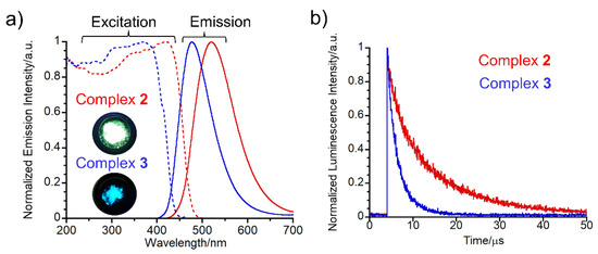 (a) Emission (solid lines, excited at 380 nm) and excitation (dashed lines, observed at 519 nm for 2 and 478 nm for 3) spectra of 2 (red lines) and 3 (blue lines) in the solid state at room temperature. Photographs of 2 (top) and 3 (bottom) under 365 nm light irradiation. (b) Transient luminescence decay curves of 2 and 3 at room temperature.