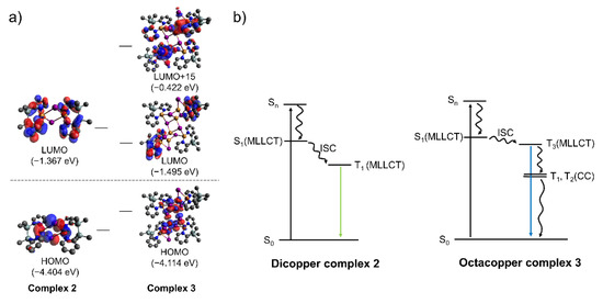 To investigate the conflict of the energy gap and the emission wavelength in these complexes, we next performed time-dependent DFT (TD-DFT) calculations. Because complexes 2 and 3 showed phosphorescence, TD-DFT calculations were performed including triplet excitations (Figures S11 and S12 and Tables S2 and S3). The lowest energy singlet transitions of 2 and 3 were calculated as HOMO → LUMO excitations, which corresponded to metal-ligand-to-ligand charge-transfer (MLLCT) transitions. The lowest triplet excitations, which should be related to the emission for these complexes, were the corresponding MLLCT excited state for the dicopper(I) complex 2 but a cluster-centered (CC) excited state for the octacopper(I) complex 3 (for example, HOMO → LUMO + 15 in Figure 4a). The corresponding 3MLLCT excited states of 3 were found at higher energy than the CC excited states and the MLLCT excited state of 2. In some copper iodide complexes, dual emission from similar 3MLLCT and 3CC excited states has been reported [61]. Therefore, both 3MMLCT and 3CC excited states in 3 are also potentially emissive.
