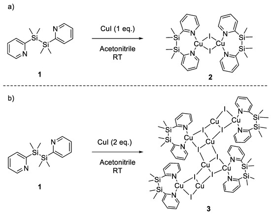 The disilanylene-bridged bispyridine ligand 1 was synthesized by a reaction of 2-pyridyllithium with 1,2-dichloro-1,1,2,2-tetramethyldisilane. The structure was determined by 1H and 13C NMR (Figures S7–S10) and high-resolution mass spectroscopy. The dinuclear copper(I) iodide complex [Cu(µ-I)(1)]2 (2) was obtained by a reaction of copper(I) iodide and 1 in acetonitrile in a 1:1 ratio (Scheme 1a). The complex 2 was isolated as an air-stable pale-yellow solid. Single crystals were obtained by recrystallization from dichloromethane and n-hexane. Elemental analysis of 2 gave the expected composition. Single-crystal X-ray diffraction analysis revealed that the molecular structure consists of bimetallic iodo-bridged neutral complex [Cu(µ-I)(1)]2, and selected bond distances and angles are shown in Figure 1. The complex was crystallized in the triclinic space group P-1, and the asymmetric unit (half of the complex) was related with an inversion center. Two copper atoms were bridged by two iodo ligands, and each copper center was supported by a bidentate ligand 1 in an N2I2 distorted trigonal pyramidal geometry. The Cu1 atom positioned 0.315 Å out of the basal plane defined by N1, N2, and I1 toward I2. The torsion angle of the disilane moiety (C(pyridine)‒Si‒Si‒C(pyridine)) is 98.51(8)°, which indicates the staggered conformation of the disilane moiety. The distance of two copper atoms (3.8761(3) Å) was longer than the double of the covalent radius of copper (1.32 Å), which suggested the negligible direct Cu…Cu interaction [39,40]. The Si1‒Si2 distance (2.3441(7) Å) was in the normal range of Si‒Si bonds, and the Cu…Si distances were larger than the sum of the van der Waals radii of Cu and Si, suggestive of the absence of σ-bonding interaction between the Cu and Si‒Si bond [36]. The Cu‒I distances (2.7405(3) and 2.9689(3) Å) are significantly larger than those of related complexes with a Cu2I2 core [41,42,43,44]. The Cu‒N distances (1.987(2) and 1.993(2) Å) are slightly shorter than usual (2.02 Å for unsubstituted pyridine analogue), and the N1‒Cu‒N2 bite angle in the complex was 140.45(6)°, ideally 120° in a trigonal pyramidal geometry. This large bite angle possibly affects the long Cu‒I bond in the Cu2I2 core because it makes the distance between the methyl groups on the linker and iodide ligands shorten to induce the steric repulsion (the shorter C(Me)…I distance was 4.196(2) Å). The crystal packing pattern of 2 shows columns along with the c-axis. From the viewpoint of crystal packing, CH…π interactions were observed between methyl groups and pyridine rings, similarly to other disilyene-connected aromatic compounds (Figure S1) [45]. It is noteworthy that no significant π…π stacking was observed in the crystal packing (the intermolecular distance of adjacent pyridine-ring centroids: 4.31 Å), suggesting that the bulky linker moiety suppress the undesirable intermolecular π…π stacking as designed (Figure S3). We measured the powder XRD of 2. The comparison of the diffraction pattern between the powder and single crystal of 2 is shown in Figure S6a. We did not observe any major changes in the diffraction pattern.