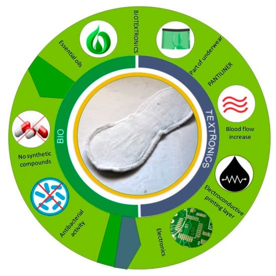 The treatment of lower urinary tract inflammations includes not only antibiotics or nitrofurantoin-based medicines, but also hip baths or steam baths with essentials oils, which are recommended by doctors to be taken from several times a week, to 2–3 times a day in the initial phase of the treatment. Hot water or steam increases blood flow, which helps the treatment, and essential oils added to the hot water support healing and relieve discomfort [,,,,]. The treatment should be conducted for 15–20 min, which is uncomfortable and difficult to realize day-to-day. That is why the idea of a biotextronics system for protection and support of the lower urinary tract inflammation treatment, facilitating mobility, came to be. The biotextronics system combines essential oils with antibacterial activity, serving as bioactive elements of natural origin and electroconductive printing layers, enabling heating of the pantiliner. Essential oils, with antimicrobial and anti-inflammatory action, in combination with thermal action, alleviate the symptoms of the disease and reduce the multiplication of bacteria (Figure 1).