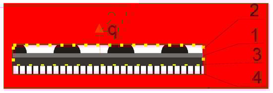 Diagram of the clothing package of the textronics system: 1—textronics heating insert; 2—outer insulating layer, made of non-woven viscose; 3—inner insulating layer made of woolen fabric; 4—a layer of a personal underwear; q—heat flux.
