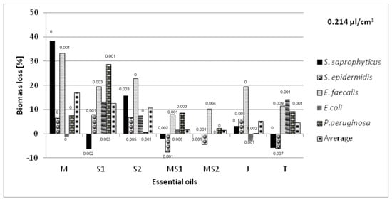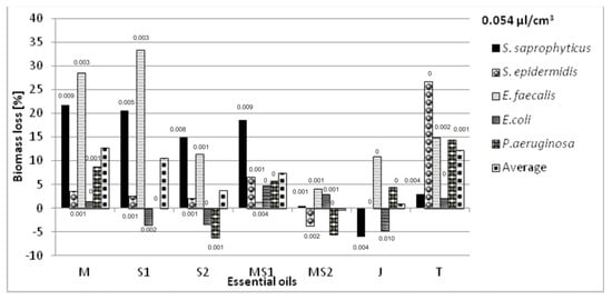 The selected essential oils applied on the material have various impacts on individual species. The greatest biomass loss was observed for Matricaria chamomilla L. essential oil against S. saprophyticus (38%) and E. faecalis (33%) in the highest oil concentration. However, in that concentration, it caused a slight increase in biomass of E. coli (1%). There was also a significant increase in biomass in the microatmosphere of 0.054 and 0.106 µL/cm3 of Salvia officinalis L. against E. faecalis (33 and 32%, respectively) and Salvia lavandulaefolia Vahl. against S. saprophyticus (31%) in the microatmosphere of 0.106 µL/cm3 (Figure 3 and Figure 4).