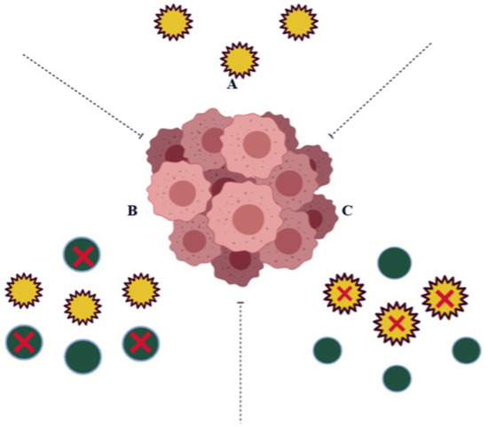 Diagrammatic representation of therapeutic approach with reduction of NQO1 levels in tumor cells results in decreased tumor burden: (A) normal liver expressing NQO1 (yellow circles) at normal level; (B) NQO1 (yellow circles) over expressed in tumor cells; (C) treating with anti-NQO1 drugs leads to the decreased tumor burden by decreased level of NQO1 (inhibited NQO1 black circles).