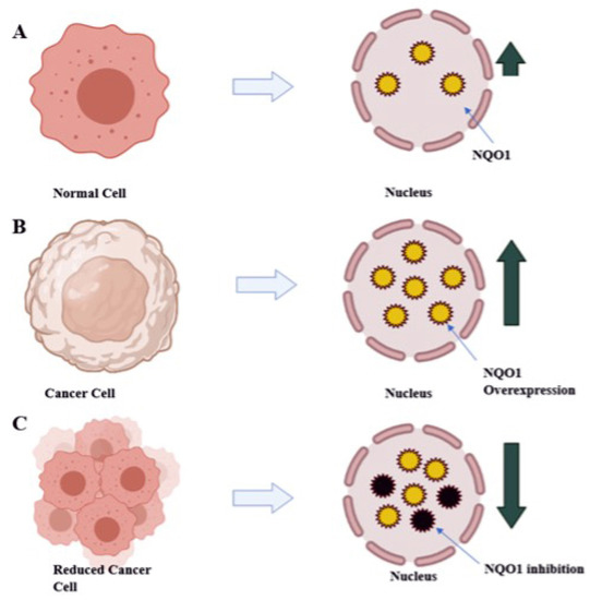In some cases, (A) the expression levels of NQO1 (yellow circles) in a normal cell play a vital role in protecting the cells against harmful components; (B) in cancer cells, the over expression of NQO1 detoxifies Quinine molecules (green circles) resulting as Quinone resistant; (C) the inhibition of NQO1 in cancer cells avoids Quinone detoxification and shows susceptibility to anti-cancerous agents.