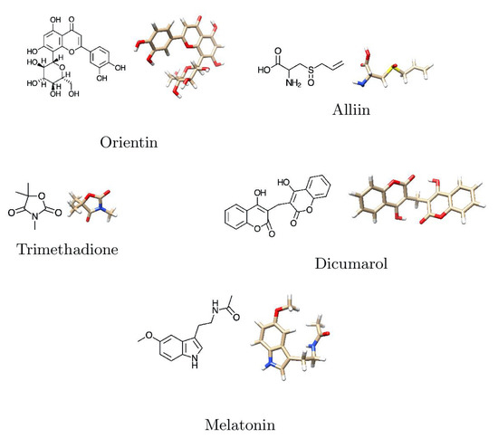 Because global hardness is a direct measure of electron density deformation and chemical reactivity, which is related to the HOMO-LUMO gap, it can be seen that Orientin will be the most reactive ligand, with Dicumarol and Melatonin being very similar in reactivity, and Trimethadione will be the least reactive of all the ligands considered. The electrodonating power EDP is more important than its electroaccepting EAP counterpart for all the ligands, which can be explained in terms of their molecular structures. However, when the values of EDP and EAP for each molecule are compared, it can be deduced that the Orientin and Dicumarol ligands will have considerably different reactivity than the other ligands. The electrophilicity index encompasses the equilibrium between an electrophile’s tendency to acquire extra electron density and a molecule’s resistance to exchanging electron density with the environment [71]. According to an electrophilicity scale for classifying organic molecules as strong, moderate, or marginal electrophiles (>1.5 eV for the first case, between 0.8 and 1.5 eV for the second case, and 0.8 eV for the last case) [72,73,74] and a review of Table 5, all ligands can be classified as strong electrophiles with the exception of Trimethadione.