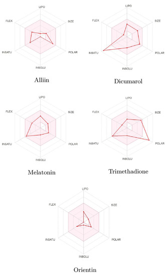 Bioavailabity radars of phytobioactives based on physicochemical indices with ideal values for oral bioavailability.