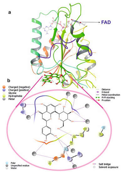 Molecular docking is a commonly used approach in drug discovery for drug discovery with little or no adverse effects. It is a two-step process that begins with geometrical optimization of the ligand and target biomolecule. The conformations in the receptor-identified active region are then ranked according to their score, which varies from one software to the next depending on the algorithms used to develop them. Among the selected compounds, Orientin was found to be more potent against NQO1. All the listed compounds in Table 1 interacted with NQO1, but Orientin bound away from the coenzyme such as FAD binding to NQO1 (Figure 10), resulting in the non-competitive type of inhibition. Orientin interacts with NQO1 via hydrogen bond with Arg272, Lys141, and plenty of water molecules present at Orientin’s non-competitive bind site (Figure 10a,b). These results implicate that Orientin binding with NQO1 is very strong as compared to other compounds (see Table S2 of the Supplementary Materials).