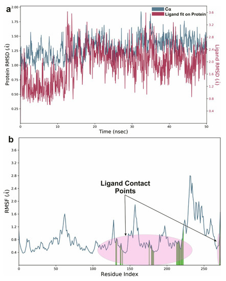 In the present study, a molecular dynamics simulation was carried out on a 64-bit Ubuntu 20.04 platform, in a Dell Precision 7820 equipped with Intel Xeon Gold (20 core), 512 GB RAM, and 24 GB Quadro RTX-6000 Nvidia GPU. MDSs for Orientin were carried out against NQO1 proteins. The water model was inserted in the docked protein-ligand complex in an orthorhombic periodic border of the box under solvated conditions using a system-builder such as TIP3P (transferable intermolecular potential with three points). To neutralize the system, Na+ ion (51.216 mM, with the charge of +31) and Cl− (56.173 mM, with a charge of −34) for NQO1 was used. This step automatically neutralizes the charge of the system during the study of the protein dynamics when the ligand is competing at the binding site [30,31]. Furthermore, a molecular dynamics simulation was carried out under some periodic boundary conditions in the atom numbers, pressure, and temperature (NPT) ensemble, with the temperature set to 300 K and 1 atmospheric pressure, then relaxed using the Desmond program’s default relaxation methodology. The simulation job took 50 nanoseconds to complete. RMSD (Root-mean-square deviation), RMSF (Root-mean-square fluctuation) and the total energy of complexes were analyzed by using event analysis and simulations-interaction diagrams [32].