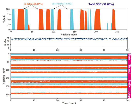 Protein secondary structure elements (SSE) like -helices and -strands are monitored throughout the simulation. The plot above reports SSE distribution by residue index throughout the protein structure.