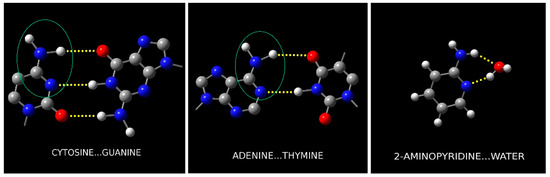 Illustration of the analogies between the hydrogen bonding configuration in the nucleic acid base pairs and AMW. The H2NCN atomic segment is present in each left hand molecule, and so is the top NH...O hydrogen bond. The N...HN hydrogen bond closing the intermolecular ring in nucleic acid chains is replaced by the N...HO hydrogen bond in 2-aminopyridine...water.