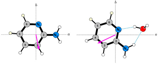 Orientation of AMP and of AMW, and of their electric dipole moments in the principal inertial axes. The dipole moment arrows are drawn from the notional negative to the notional positive charge and it can be seen that the μb component is dominant in AMP, whereas the μa component is dominant in AMW. The orientations of the quadrupole tensors on the two nitrogen atoms, the ring nitrogen Nr (with z axis close to the ∠CNC bisector), and the amino nitrogen Na (with z axis close to the C–NH2 bond), are also significantly different in AMP and in AMW. The substitution sites for the singly deuterated isotopologues of AMP, d-5, and d-6, synthesized in this work and used in both AMP and AMW measurements are marked in yellow.