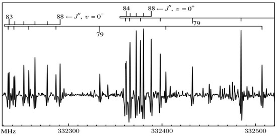 Presently we extended the measurements of the spectrum of AMP to 258.1–332.8 GHz, that is, to the onset of the submillimeter wave region. The aim has been to enable predictions of the spectrum for possible astrophysical applications and to integrate new data with supersonic expansion measurements (see further below) in order to derive the most precise values of spectroscopic constants for use in structural analysis. At near-submillimeter frequencies and the correspondingly large quantum number values the spectra of near planar molecules are characterized by so-called type-II bands made up of R-branch rotational transitions. Bands of this type also dominate the spectrum of AMP, as illustrated in Figure 3. The onset of such bands in the CMW region was identified by Borchert [7], who initiated the terminology in order to distinguish from type-I bands, in which transitions are for the same value of J”. Band evolution towards dense clumps of lines was later described in connection with the chlorobenzene molecule [8], while band properties were generalized in [9,10]. Type-II bands are most prominent in high-J rotational spectra of near planar molecules and the distribution of lines in each band is critically dependent on the value of the inertial defect Δi = Ic − Ia − Ib. The differences in the appearance of the 0+ and 0− bands in Figure 3 are due to a relatively small change in the inertial defect, with values for the two states being −0.2642 and −0.4390 uÅ2, respectively.