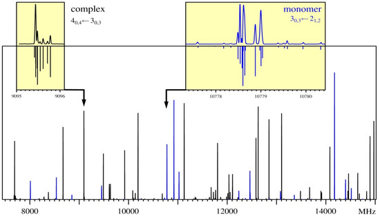 Cavity FTMW spectroscopy of supersonic expansion allows observation of the sample at an effective rotational temperature of around 1 K so that complicated but compact nuclear quadrupole splitting structures resulting from the presence of two 14N nuclei in AMP (and AMW) can be successfully resolved and measured. This is illustrated in Figure 4 for the AMP-d-6 isotopologue.