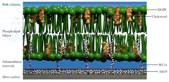 The development of biological membrane models emerged over the past few decades to systematically study fundamental processes at lipid bilayer interfaces, such as the membrane proteins functioning, cell–cell signaling, or protein–membrane interactions. Biomimetic membrane models should provide a simplified system for coherent investigation of the membrane while maintaining the fundamental membrane characteristics, such as membrane fluidity or electrical sealing properties []. Tethered bilayer lipid membranes (tBLMs) are considered as a comprehensive experimental platform for membrane biosensors. They have been used in various studies ranging from the analysis of biological membrane structure and functions, studies of the membrane–protein and cell–membrane interactions, antigen and antibody binding, also applications as biosensors and energy-generating devices []. In such biomembrane models, a fluidic lipid bilayer is attached and stabilized on a solid surface via a thin organic layer.