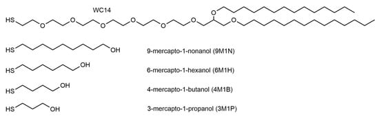 Freshly prepared SERS sensors and flat silver electrodes were immersed in 0.1mM (total thiol concentration) of ethanolic solution mixture containing the tether WC14 (20–tetradecyloxy-3,6,9,12,15,18,22 heptaoxahexatricontane–1–thiol; synthesized in–house) [] and four different short-strand backfiller molecules at molar ratio 20:80 mol% (unless advised otherwise): 3-mercapto-1-propanol (3M1P), 4-mercapto-1-butanol (4M1B), 6 mercapto-1-hexanol (6M1H), and 9-mercapto-1-nonanol (9M1N) (Sigma–Aldrich, St. Louis, MO, USA) (Figure 2). Incubation of the silver substrates in the solutions was carried out for 3 h to form self-assembled monolayers (SAMs). Then the substrates were washed in pure ethanol and dried under the stream of nitrogen.