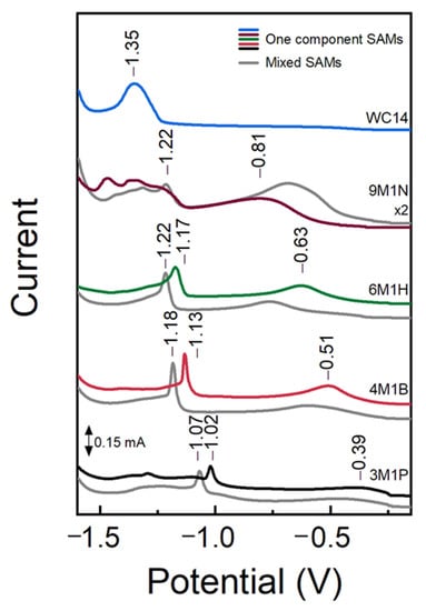 Potentiodynamic curves of one component SAMs (colored lines) and mixed component SAMs (80% backfiller: 20% WC14) (grey lines). Reductive desorption was performed from Ag film in 0.5 M NaOH + 0.1 M Na2SO4 deaerated aqueous solution at the sweep rate of −50 mV/s. The desorption curves of 9M1N and 9M1N + WC14 SAMs were multiplied by two.