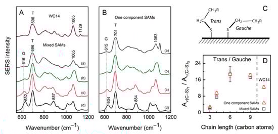 (A) SERS spectra of Ag adsorbed WC14 (top curve) and mixed SAMs containing different backfillers and (B) one component SAMs. The order of curves is 9M1N (a), 6M1H (b), 4M1B (c), 3M1P (d). Letter G and T denote gauche and trans conformation. (C) Schematic representation of surface adsorbed thiol molecules in the gauche and trans conformation. The conformation was defined by the dihedral angle of the –S–C– bonding (D) T/G ratio dependence on the chain length in carbon atoms of backfiller. The composition of mixed SAMs was 80% backfiller and 20% WC14. Mean ± SD were calculated from 3 measurements.