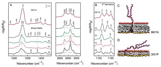 (A) RAIRS spectra of Ag adsorbed WC14 (top curve) and mixed SAMs containing different backfillers in the following order: 9M1N (a), 6M1H (b), 4M1B (c), 3M1P, (d) in the 900–1600 and 2750–3050 cm–1 range. The composition of mixed SAMs was 80% backfiller and 20% WC14. Dashed curves in C–H stretching region represent one-component monolayers that had, on average, a 5-times lower area under the curve than the corresponding mixed SAMs. (B) The second derivative RAIRS spectra in νas(C–O–C) region (multiplied by −1). The arrangement of the spectra corresponded to that of the (A) panel. Panels (C,D)—proposed model of WC14 molecules orientation on Ag surface (at air/solid interface): (C) WC14 diluted with 9M1N in ratio 20:80% WC14/3M1P; (D) WC14 diluted with 3M1P in ratio 20:80% WC14/9M1N.