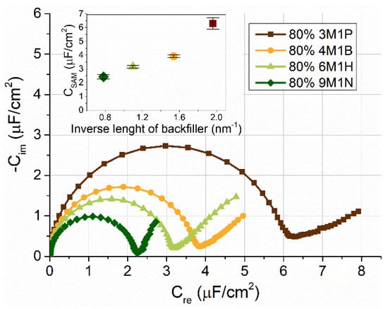 Representative EIS spectra of mixed WC14/backfiller (in ratio 20:80%) SAMs containing different backfillers: 3M1P, 4M1B, 6M1H, and 9M1N. The Cole–Cole complex capacitance plots; Inset demonstrates capacitance values of different-backfiller SAMs as a function of backfiller length (nm−1). Frequency range 100 kHz–0.1 Hz.