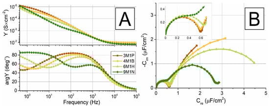 In a previous study, we reported the ability of WC14/3M1P SAMs to form intact tBLMs by vesicle fusion on silver support []. In this study, in all cases, the semi-circular part of the EIS spectra sharply decreased (Figure 7B compared to Figure 6). After vesicle fusion, the high-frequency semi-circular arch now pointed to all values spanning around ~0.6 μF/cm2, not depending on the SAM backfiller. Even the capacitances of mixed SAMs, containing 6M1H and 9M1N that were below 4 μF/cm2 (Figure 6), have decreased after vesicle fusion suggesting the formation of the lipid bilayer. The full Cole–Cole plot exhibited a typical “two semicircle” shape, which is a characteristic of disrupted integrity of tBLM (Figure 7B). From the mathematical analysis by Valincius et.al., such a well-expressed secondary semicircle in Cole–Cole EIS plots signal the higher number of natural defects occurring in the initial membrane [].