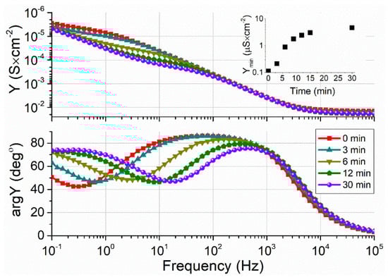 Figure 8 displays EIS Bode plots of the tBLMs after interaction with 2 nM of VLY depending on incubation time. The step-like feature in the admittance modulus curve dropped down after interaction with VLY, signaling an increase in the conductance of tBLMs (Figure 8 (upper panel)). During the 30 min incubation, the value of admittance modulus in the fmin point increased nearly two-fold. Additionally, on an admittance phase vs. frequency plot, minima developed, which shifted towards a high-frequency edge as the incubation time of VLY increased (Figure 8 (lower panel)). The continuous phase shift in EIS spectra attests for the increasing damage of tBLMs by the pore-forming toxin with time, as observed in tBLMs assembled on gold supports []. Other reasons than transmembrane pore-formation that possibly may affect tBLM stability were excluded by tests involving the neutralizing antibodies, which exhibited full protection of tBLMs in the presence of VLY [].