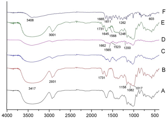Figure 3. FT-IR spctra of (A) native cassava starch; (B) CA; (C) OSA-CA; (D) the mixture OSA-CA and Q; (E) OSA-CA/Q; (F) quercetin.