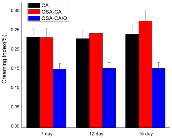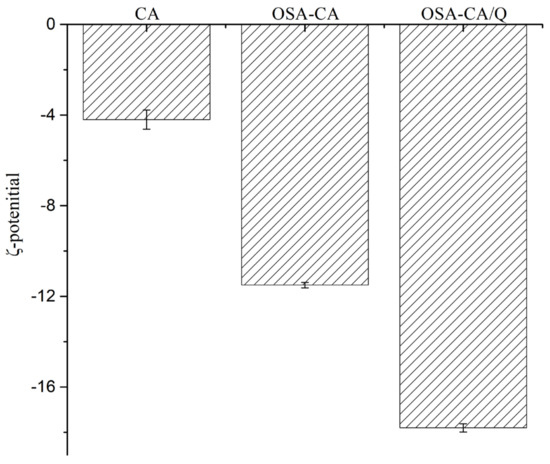 Zeta potential, a measure of mutual exclusion or attraction between emulsion particles, is an important indicator of the electrostatic stability of an emulsion system. As shown in Figure 5, the zeta potential of enzyme-modified starch was −4.2 ± 0.6 mV. Compared with enzyme-modified starch, the zeta potential of OSA-CA was relatively high (−11.5 ± 0.4 mV) after the hydrophobic modification, indicating an increase in the charge density of the OSA-CA surface and in the electrostatic stability of the emulsion [42]. After the inclusion of quercetin, the zeta potential of OSA-CA/Q decreased to −17.8 mV, which may have been due to the relatively high concentration of this flavonoid within particles. However, as reported by Pool et al., particle charge is not strongly affected by the presence of quercetin [43].
