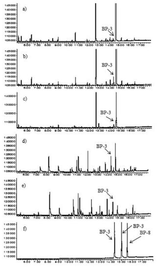 Chromatograms of (a) hair mask sample—SPE method; (b) hair mask sample with addition of BP-3 standard—SPE method; (c) hair mask sample—MEPS method; (d) shampoo sample–SPE method; (e) shampoo sample—MEPS method; (f) standard solution of BPs at concentration of 50 µg mL−1.