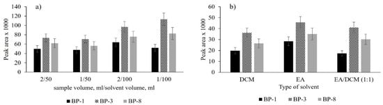 For this reason, it was checked whether the sorption bed was overloaded (1 and 2 mL of sample) and whether the amount of eluent was sufficient to elute the analytes (50 and 100 µL) with the use of different eluents (DCM, EA, and EA/DCM mixture (1:1, v/v)). An effect of these variable parameters on the peak areas is presented in Figure 2.