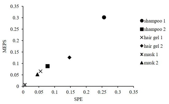 The suitability of both methods for the determination of BP-3 in cosmetics samples with different composition was also confirmed. The tests were performed on the following cosmetics: two different shampoo samples and two different samples of a hair mask containing BP-3 and a hair gel to which BP-3 was added in two concentrations. Analyses of BP-3 content in these samples were performed by SPE and MEPS methods using the calibration method described above. The results of quantitative analysis are presented in the form of a graph (Figure 3).