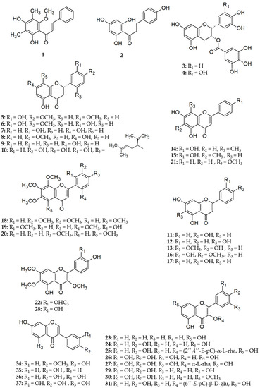 A study conducted by [64] showed that sub-inhibitory concentrations (0.25 × MIC) of the flavanones eriodictyol-7,4′-dimethyl ether (5) and naringenin-4′-methyl ether (8) isolated from Chromolaena odorata decreased the MIC of the universal efflux pump substrate EtBr against MRSA clinical isolates and the reference MRSA strain ATCC 33591 by 4- or 8-fold. Therefore, these compounds exceeded the enhancing effect of a concentration of 50 mg/L reserpine, which is a common inhibitor of S. aureus efflux pumps. The chalcone 2′,4-dihydroxy-4′,5′,6′-trimethoxychalcone was only active against the clinical isolates, and therefore not included in Table 1. Mutually tested flavonols like methyl ethers of quercetin and kaempferol showed no efflux pump inhibitory activity. The MIC of EtBr against a methicillin-sensitive S. aureus strain was not changed or was just changed twofold in combination with the two effective flavanones [64]. Another flavanone, pinocembrin (9), isolated from Alpinia katsumadai seeds, showed increased EtBr accumulation at 64 mg/L, comparable to CPZ in M. smegmatis, but was less effective than CPZ in the EtBr efflux assay [50]. The same compound was also obtained from Alpinia calcarata, but could not prove its EtBr efflux inhibitory effects in S. aureus 1199B when compared to the corresponding wild type strain S. aureus 1199 and the NorA knockout mutant K1758 [65]. Sophoraflavanone G (10) showed a synergistic effect when combined with norfloxacin against the NorA overexpressing S. aureus 1199B (16-fold reduction in the MIC of norfloxacin), which could be confirmed by an EtBr efflux experiment. Even more interestingly, this increased norfloxacin sensitivity could be confirmed in vivo [66], supporting the concept of EPI to be applied in combination with known antibiotics in infectious diseases.