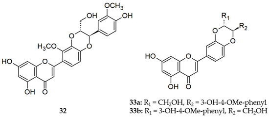Structures of flavonolignans 32 and 33 (i.e., diastereomeric mixture of 33a and 33b).