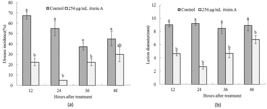 Effects of treatment time of iturin A on soft rot incidence (a) and lesion diameter (b) of cherry tomato fruit. Error bars represent standard errors of three replicates. Significant differences (p < 0.05) were shown by different letters on each column based on Duncan’s multiple range test.