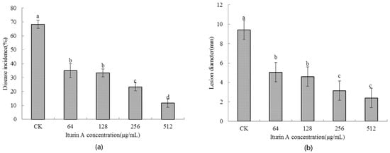 Effects of concentration of iturin A on soft rot incidence (a) and lesion diameter (b) of cherry tomato fruit. Error bars represent standard errors of three replicates. Significant differences (p < 0.05) were shown by different letters on each column based on Duncan’s multiple range test.