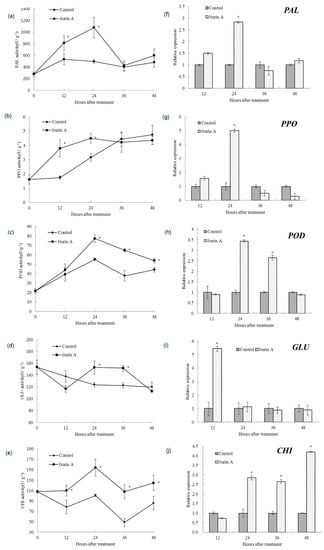 Activities of PAL (a), PPO (b), POD (c), GLU (d), and CHI (e) and relative expression levels of PAL (f), PPO (g), POD (h), GLU (i), and CHI (j) in cherry tomato fruit after treatment with sterile distilled water (control) and 512 μg/mL of iturin A. The vertical bar represents the standard error for three replicate samples and the asterisks (*) represent significant differences between the iturin A treatment and the control by the unpaired t-test (p < 0.05).