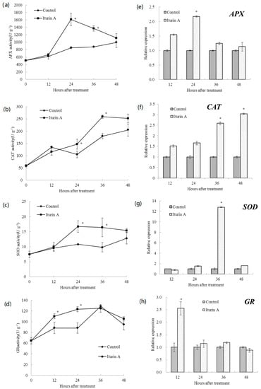 Activities of APX (a), CAT (b), SOD (c), and GR (d) and relative expression levels of APX (e), CAT (f), SOD (g), and GR (h) in cherry tomato fruit after treatment with sterile distilled water (control) and 512 μg/mL of iturin A. The vertical bar represents the standard error for three replicate samples and asterisks (*) represent significant differences between the iturinA treatment and the control by the unpaired t-test (p < 0.05).