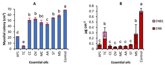 Effect of essential oils extracted from eight Tunisian plants used at 0.1 µL·mL−1 on the mycelial growth (A) and the accumulation of enniatins (ENNs) (B) by F. avenaceum. Values are means of 3 replicates. Error bars are ± standard deviation. Means with the same lowercase letter are not significantly different (p < 0.05). ENB1 = enniatin B1, ENB = enniatin B. AP1 = Ammoides pusilla, TC = Thymus capitatus, CC = Carum carvi, OV = Origanum vulgare, MC = Myrtus communis, AA = Artemisia absintum, ST = Schinus terbentofonius, MS = Mentha spicata.