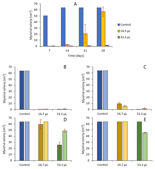 Mycelial growth of F. avenaceum in presence of volatile compounds from 16.7 or 33.3 µL EO L−1 in consecutive cultures. (A) First exposure to volatiles. (B,C) second exposure with the same quantity of EO as in the first exposure of fungal material coming from (A) as spore suspension (dark bars) or plugs (light bars) (second culture-EO). (D,E) second culture without EO of fungal material coming from (A) as spore suspension (dark bars) or plugs (light bars); µL are those of the first exposure (second culture-control). (B,D) are measures at 10 days, (C,E) are measures at 28 days. Means of 3 replicates. Error bars are ± standard deviations.