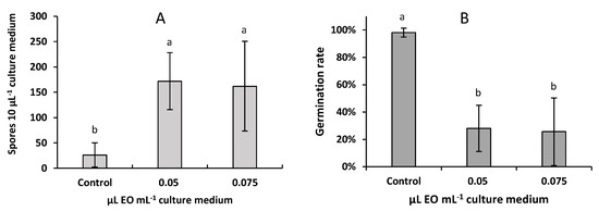 Changes in sporulation capacity (A) and rate of spore germination (B) after treatment with two concentrations of A. pusilla EO for 24 h. Means of 3 replicates. Errors bars are ± standard deviations. Means with the same lowercase letter are not significantly different (p < 0.05).