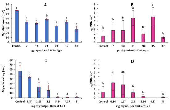 Effect of thymol on the mycelial growth rate (A,C) and production of ENNs (B,D) by F. avenaceum. Thymol was either diluted in the culture medium (A,B) or use as a fumigant (C,D). Values are means of 6 replicates. Error bars are ± standard deviation. Means with the same lowercase letter are not significantly different (p < 0.05).