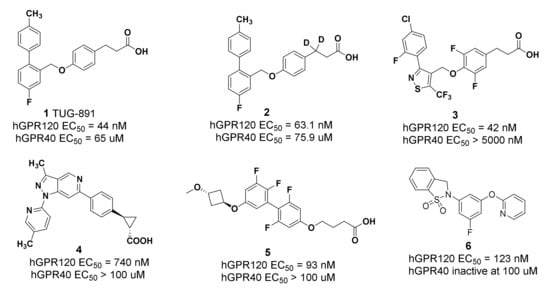 - Zhang, X.; Cai, C.; Sui, Z.; Macielag, M.; Wang, Y.; Yan, W.; Suckow, A.; Hua, H.; Bell, A.; Haug, P.; et al. Discovery of an isothiazole-based phenylpropanoic acid GPR120 agonist as a development candidate for type 2 diabetes. ACS Med. Chem. Lett. 2017, 8, 947–952. [Google Scholar] [CrossRef] [PubMed]