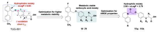 In this study, we designed compounds 1f–7f by introducing substituents on the benzene ring, introducing substituents on the α or β position of phenylpropionic acid or substituting oxygen atoms for carbon atoms at the β position of phenylpropionic acid to improve the metabolic stability of TUG-891 [,]. Compounds with excellent GPR120 agonist activity and selectivity were used as lead compounds to design compounds 11a–11h for the improvement of hydrophilicity by replacing the biphenyl structure with polar linking groups (Figure 2). Compounds 11a–11h were synthesized and tested for GPR120 activation in vitro. Compounds with excellent GPR120 agonistic activity were selected to evaluate selectivity, pharmacokinetic properties, and antidiabetic activity in vivo. The results showed that compound 11b had good GPR120 agonistic activity, selectivity, and pharmacokinetic properties, and could reduce the blood glucose of normal mice in a dose-dependent manner. In addition, it showed good anti-hyperglycemic activity in diet-induced obese (DIO) mice. Compound 11b may be a promising drug candidate for the treatment of T2DM.