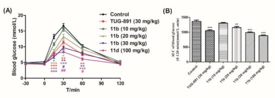 Effects of compound 11b and TUG-891 on plasma glucose levels during the oral glucose tolerance tests (oGTT) in fasting ICR mice. (A) Time-dependent changes of blood glucose levels after oral administration of compound 11b, followed by the oral glucose load (3 g/kg). (B) AUC-30–120 min of plasma glucose levels. Values are expressed as the mean ± SEM (n = 6). * p ≤ 0.05 compared with vehicle-treated ICR mice by Student’s t test; ** p ≤ 0.01 compared with vehicle-treated ICR mice by Student’s t test; *** p ≤ 0.001 compared with vehicle-treated ICR mice by Student’s t test; # p ≤ 0.05 compared with TUG-891-treated ICR mice by Student’s t test; ## p ≤ 0.01 compared with TUG-891-treated ICR mice by Student’s t test.