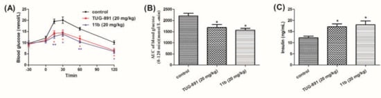 Diet-induced obese (DIO) mice were obtained by feeding male C57BL/6 mice with high-fat diet for 8 weeks. There was hardly any glucose elimination in DIO mice, which suggests severe glucose intolerance [,]. The anti-hyperglycemic effects of compound 11b were evaluated in DIO mice to assess the consequences of GPR120 agonists in an acute model of type 2 diabetes. The results showed that the blood glucose levels of the groups increased after glucose administration, and reached the maximum concentration at 30 min. Compound 11b showed anti-diabetic effects equivalent to TUG-891, and the blood glucose levels reached normal levels at 120 min (Figure 4A,B). The insulin levels at 30 min after oral administration of glucose were tested, and the results showed that compound 11b and TUG-891 significantly increased insulin levels (Figure 4C).