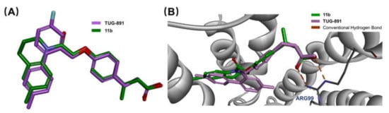 Molecular overlay studies were performed to simulate the difference in molecular conformation between compound 11b and TUG-891. Compound 11b with a hydrophilic linking group exhibited an excellent degree of overlap with TUG-891 (Figure 5A). The crystal structure of the GPR120 receptor has not been reported. Homology modeling was performed with Modeler in Accelrys Discovery Studio 2020 using the crystal structure of Turkey β1 adrenoceptor 20 (PDB code 6IBL) [], neurotensin receptor21 (PDB code 4XES) [], and β2-adrenoceptor (PDB code 3P0G) [] as templates. The structure with the lowest discrete optimized protein energy (DOPE) score was used for the molecular docking analysis. The molecular docking model showed that compound 11b was engaged in conventional hydrogen bond interactions with Arg99, which plays a very important role in GPR120 activation [] (Figure 5B). All of the simulation results suggested that compound 11b exerted anti-diabetic activity and was related to the GPR120 receptor.