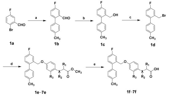 The target compounds 1f–7f were obtained according to the synthetic route summarized in Scheme 1. The 2-bromo-5-fluorobenzaldehyde and 4-tolylboronic acids were used as starting materials to synthesize intermediate 1b by the Suzuki-Miyaura cross-coupling reaction in the catalysis of Pd(PPh3)4. Intermediate 1c was synthesized by reducing intermediate 1b with sodium borohydride, and was converted to 1d by substituting hydroxyl with phosphorus tribromide. Condensation of 1d with appropriate phenolic hydroxyl by the Williamson ether synthesis reaction afforded intermediate 1e–7e, followed by hydrolysis with sodium hydroxide to generate the target compounds 1f–7f. The structures of the target compounds were confirmed by 1H-NMR, 13C-NMR, and HRMS.