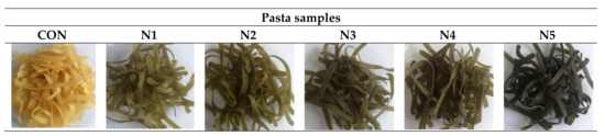 Pasta with 0–5% addition of stinging nettle. Explanation: CON—control sample; N—pasta with stinging nettle.