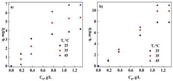 In Figure 1, the adsorption capacity of DNS at different temperatures using GAC (Figure 1a) and PAC (Figure 1b) is shown. It is also observed that the adsorption of DNS in both adsorbents is significantly affected with the increase in temperature, presenting greater adsorption when increasing the temperature; thus at 45 °C, the maximum adsorption capacity of 6.97 and 11.57 mg/g was obtained for GAC and PAC, respectively. This may be due to the environment of the removal process, which can cause the adsorbent surface to increase its participation in DNS adsorption with increasing temperature [21,25,26]. Similar behavior has been reported in the literature using commercial AC [21]; in other studies, using this adsorbent it has also been observed that there is an increase in the adsorption capacity of different compounds based on phenols [27], perchlorates [25], and heavy metals [26], among others [12].